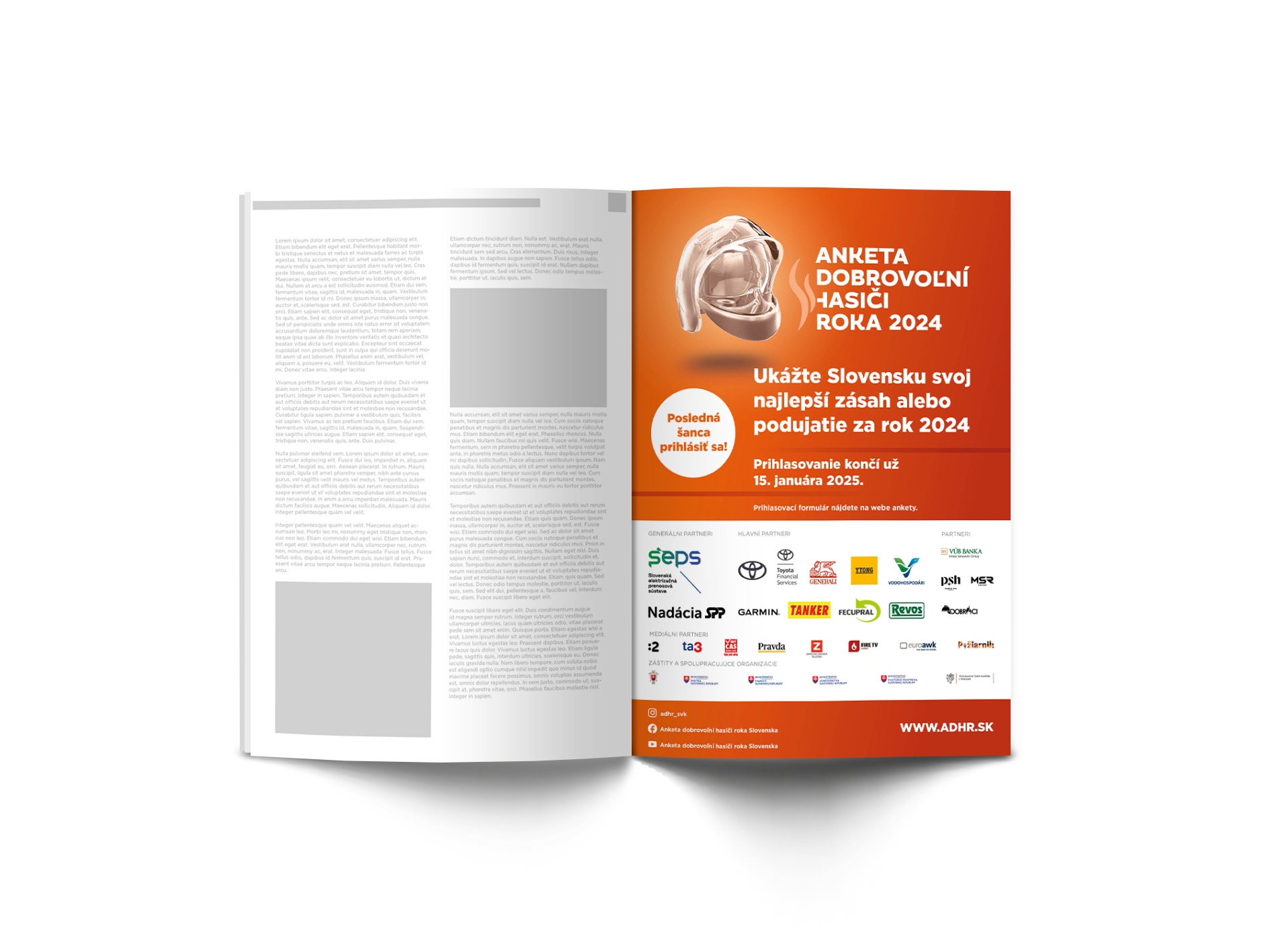 MATERIÁLY – 1. ROČNÍK ADHR 2024 LETÁK Leták A4 – Prihlasovanie do Ankety – pdf Leták A4 – Hlasovanie – jpg Leták A4 – Galavečer – jpg Leták A4 – Poďakovanie partnerom – pdf LOGO ANKETY Logo Ankety – pdf ILUSTRAČNÉ MATERIÁLY Mapa Slovenska ADHR – jpg Mock up – inzercia – jpg Mock up – billboard – jpg